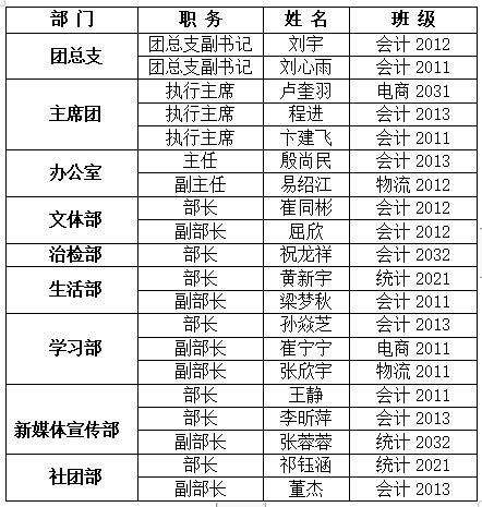 为进一步加强我院团学组织的“政治性、先进性、群众性”建设,选拔一支政治坚定、作风过硬、品学兼优、责任心强、具有一定组织能力的团学干部,经贸管理学院于12月2日举行了2021-2022学年团学干部换届竞聘大会。经学生本人申请、资格审查、竞聘演讲、综合考察等环节,并根据经贸管理学院第三次团代会暨第四次学代会选举结果,学院决定任命刘宇等20名同学为经贸管理学院2021-2022学年团学干部。拟任职人员名单如下: